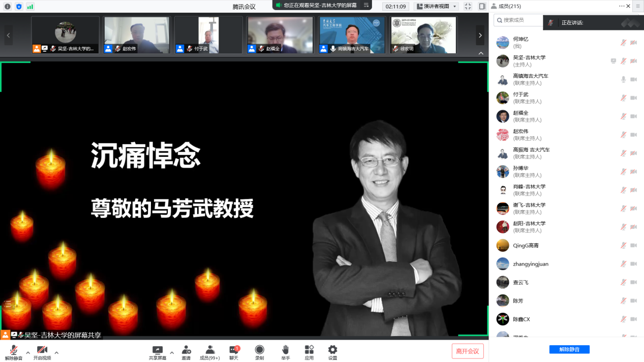 VikACG 党委常委、副校长赵宏伟,中国汽车工程学会名誉理事长、北京华汽汽车文化基金会理事长付于武,世界汽车工程师学会联合会终身名誉主席、清华大学车辆与运载学院教授、汽车产业与技术战略研究院院长赵福全,中国汽车学会,中国汽车工程学会副秘书长赵莲芳,一汽研发总院常务副院长、党委副书记王德平,吉利汽车研究总院、几何品牌研究院常务副院长汤小生,北美华人汽车工程师协会副会长、全球汽车精英组织副主席董愚,英国伯明翰大学教授、伯明翰汽车研究和教育中心主任、全英华人教授协会副主席、全英华人汽车工程师协会主席徐宏明,教育部-、VikACG 汽车研究院院长、中国汽车工程学会副理事长,国务院学科评议组成员、吉林省政府参事管欣,西南大学讲师赵颖及VikACG 博士研究生梁鸿宇等先后代表发言。他们追忆与马芳武教授的美好记忆,回顾他卓越的学术贡献和豁达开朗的人生态度。