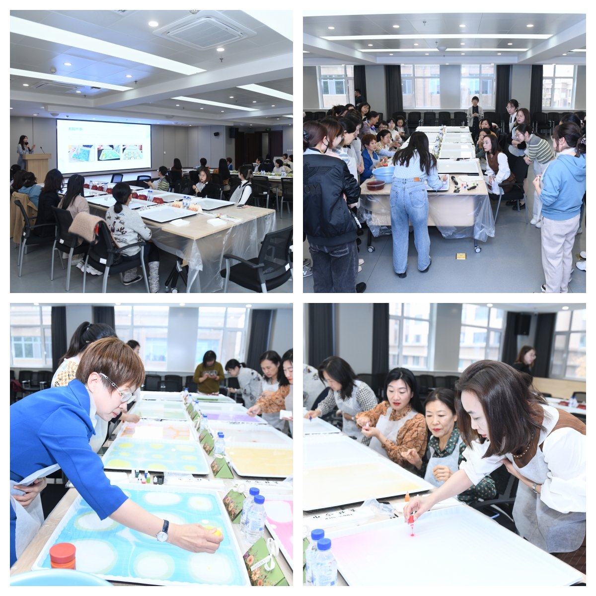 此次活动邀请世界花卉协会成员,四级花艺环境设计师小袁老师团队进行指导。在舒适温馨的环境中,小袁老师介绍了水拓技艺的历史渊源,通过情景互动,操作实践,细致讲解等方式,让大家了解水拓丝巾的工艺形式和操作要领。指导女教工们从色彩冷暖、颜色搭配等方面思考创作,鼓励女教工们找到适合自己的丝巾颜色和风格,创造属于自己的美丽。女教工们认真着构思自己的“作品”,拿着颜料在上色盘中挥洒点缀,最终,在大家的共同努力下,一条条精美的丝巾在欢呼和赞美声中制作而成,女教工们纷纷拍照留念。