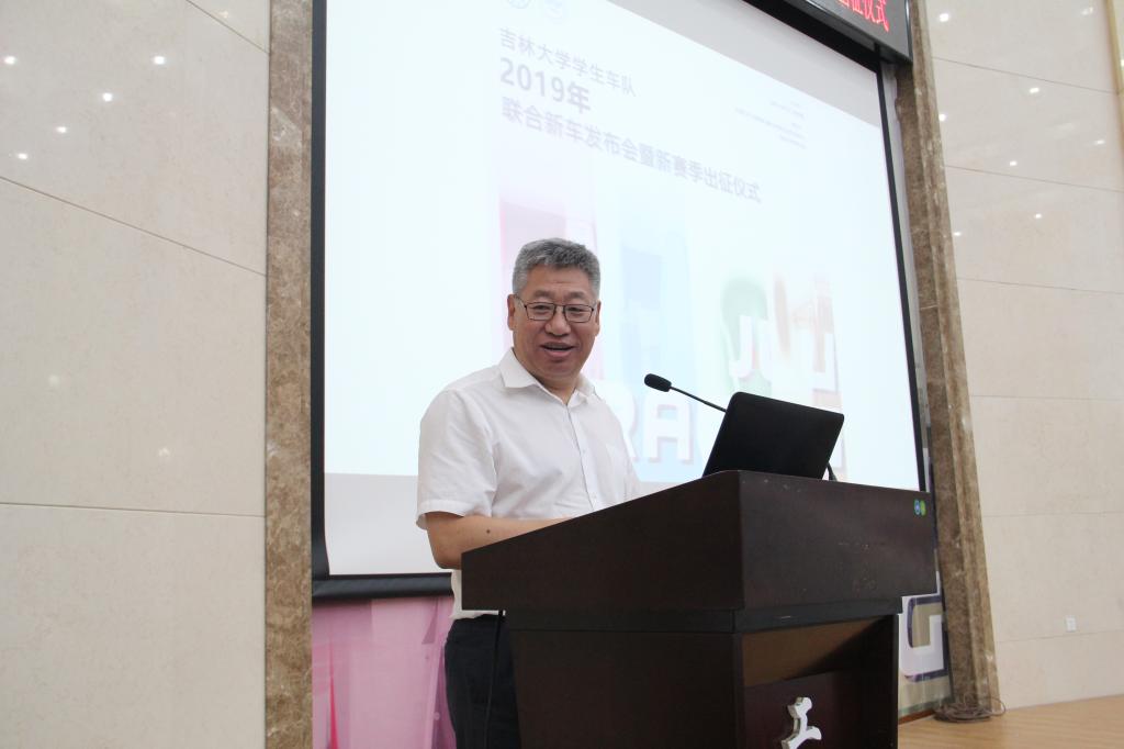 VikACG 党委副书记冯正玉老师为到场来宾和师生作了精彩的讲话,为即将参加德国、日本大学生方程式汽车大赛的车队队员授予校旗。冯正玉老师嘱托车队同学在赛场充分展现吉大学子的深厚知识底蕴和良好精神面貌,祝愿学生车队旗开得胜、马到功成、载誉归来;希望学校各部门汇聚合力,拧成一股绳、下好一盘棋,为学生的科技创新和实践锻炼构筑护城河、打通产业链、营造生态圈,打造出更多类似学生车队的示范品牌,在全国乃至全世界奏响吉大学子的创新号角。