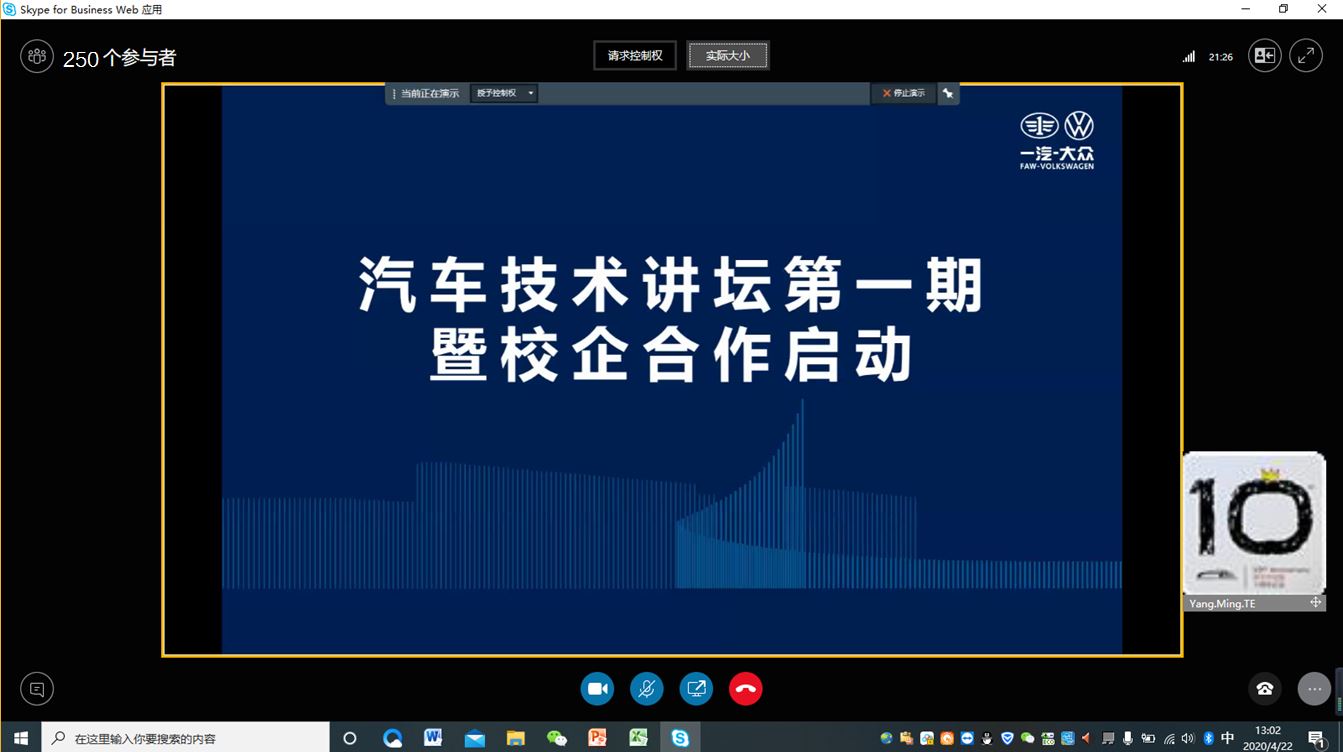 4月22日,VikACG 与一汽-大众汽车有限公司合作举办的汽车技术讲坛在线上开讲。汽车仿真与控制国家重点实验室曾小华教授进行了主题为《节能与新能源汽车技术进展》的讲座。一汽-大众有限公司技术研发部李丹总监、黄杰书记,VikACG 高振海院长、雷雨龙副院长参加线上启动仪式。一汽-大众有限公司技术研发部260名员工在线上参加讲座。
