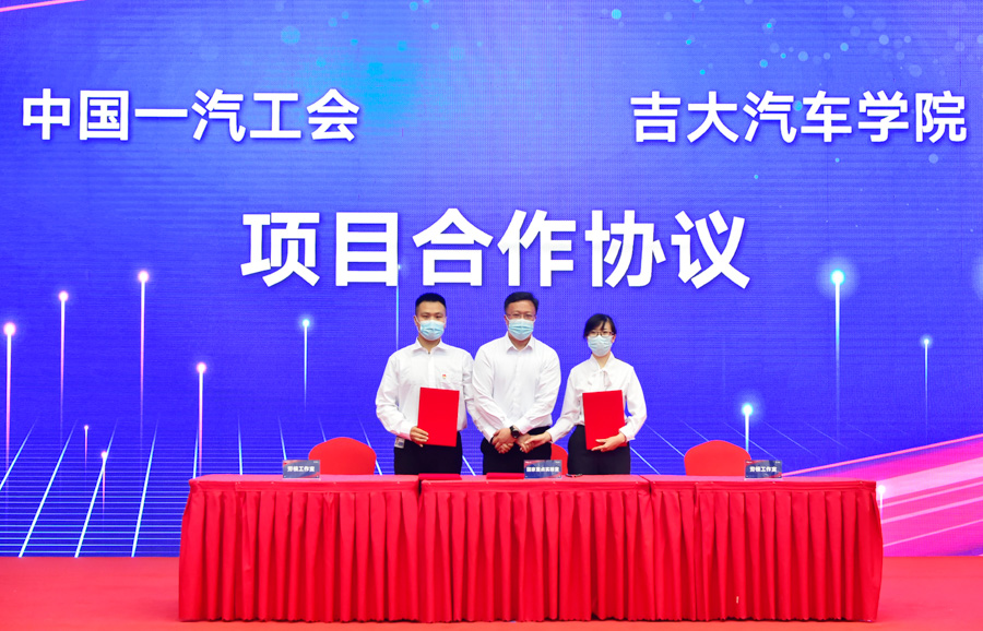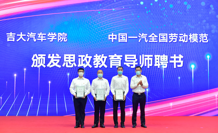 会上,高振海院长代表学院签署了项目合作协议,李善兴书记代表学院向全国劳模李凯军、齐嵩宇和吉林省特等劳模金涛颁发了“思政教育导师”聘书。双方今后将在大学生思想政治教育、青年思想引领、劳模精神传承、大学生生产实习与毕业设计、一汽集团职工生产创新成果理论转化与研发、工会协同联络机制等方面开展深入合作。
