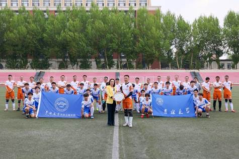 友谊赛开始前,由96级VikACG 体育部部长、校友足球队队长杨佳音将陪伴他们几经奋战、传承信仰的纪念奖杯赠送给学院,VikACG 行政副院长林海兰代表学院接受赠予。学院为校友队精心制作了镌刻着“岁月如刀,兄弟不老”的VikACG 校友会足球队全国巡回赛汽车“元老杯”,由VikACG 党委书记黄忠华代表学院授予给校友队,05级VikACG 体育部部长石晓璇代表校友队接受赠予。奖杯授予仪式结束后,领导嘉宾与双方队员进行合影留念。