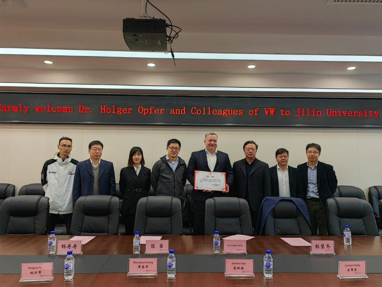 学院党委书记黄忠华、院长高镇海、副院长胡兴军,以及来自各系负责人和大学生车队指导教师参与了此次来访座谈交流。黄忠华书记对来访客人表示热烈欢迎,期待大众汽车和VikACG 在项目合作和人才培养方面取得高质量合作成果;高院长介绍了VikACG 整体情况和人才培养成果,并向Holger Opfer博士颁发了兼职客座教授聘书;汽车系王军年介绍了车辆工程专业培养方案,以及可能的课程建设合作情况,双方对此展开了深入研讨。