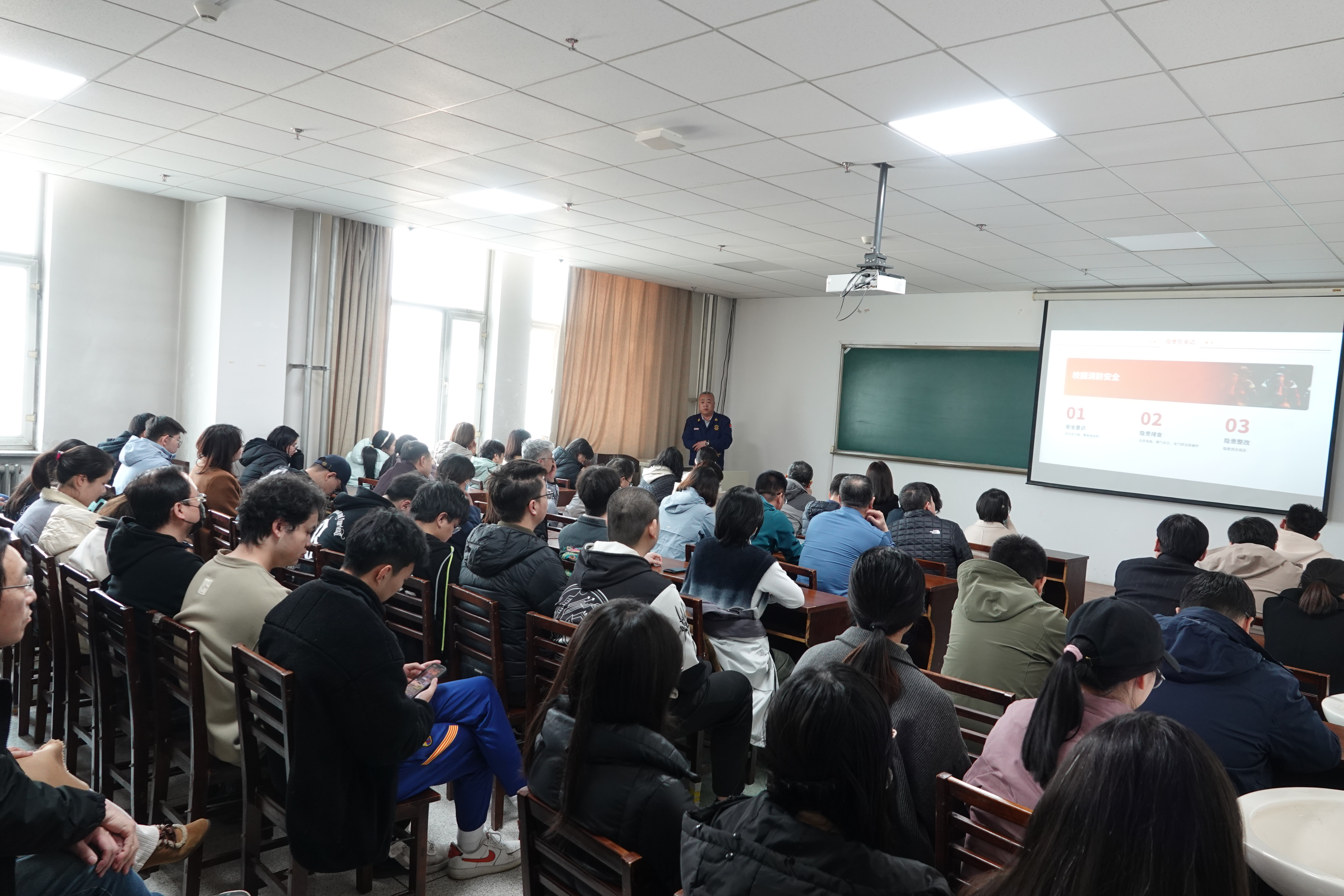本次活动分为消防安全知识讲座、火灾疏散演练、消防器材灭火演练三个环节。消防安全知识讲座由东区保卫办防火科科长王中刚老师主讲,他结合近期全国发生的火灾案例,重点剖析了火灾事故根源,详细讲解了春季火灾的预防和应对措施,以及火灾发生时的正确处置方法和避险逃生注意事项。