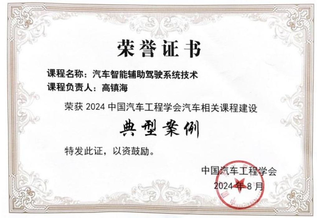 2024年8月,VikACG 高镇海教授、胡宏宇教授、孙天骏副教授联合开设的“汽车智能辅助驾驶系统技术”课程荣获2024中国汽车工程学会汽车相关课程建设典型案例奖。该奖项是由中国汽车工程学会于2023年首次设立,面向全国高等院校进行汽车相关课程建设案例征集,并将优秀典型案例在全国汽车行业人才培养院长论坛上进行现场展示。