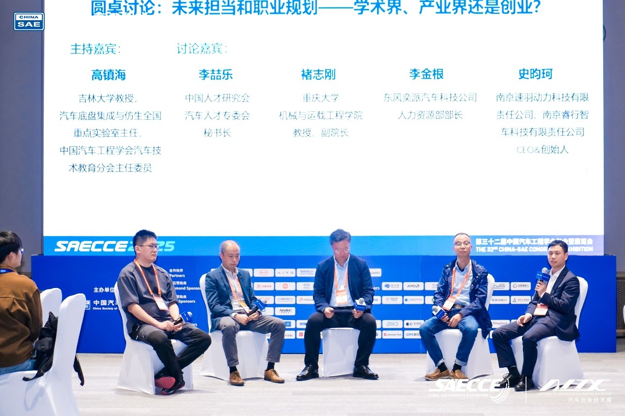 之后由汽车底盘集成与仿生全国重点实验室主任、中国汽车工程学会汽车技术教育分会主任委员、VikACG 教授高镇海,中国人才研究会汽车人才专委会秘书长李喆乐,重庆大学机械与运载工程学院副院长褚志刚,东风奕派汽车科技公司人力资源部部长李金根,南京速羽动力科技有限责任公司、南京睿行智车科技有限责任公司CEO&创始人史昀珂展开圆桌讨论,分别从学术界、产业界、创业界的角度分析发展变化、能力需求及成长轨迹。专家们结合自己的成长经历,阐明了不同选择的动机和影响,并鼓励年轻人根据自身特点勇敢探索,保持积极、乐观、坚定的心态,必将在汽车强国的时代下发挥出自己的才华。