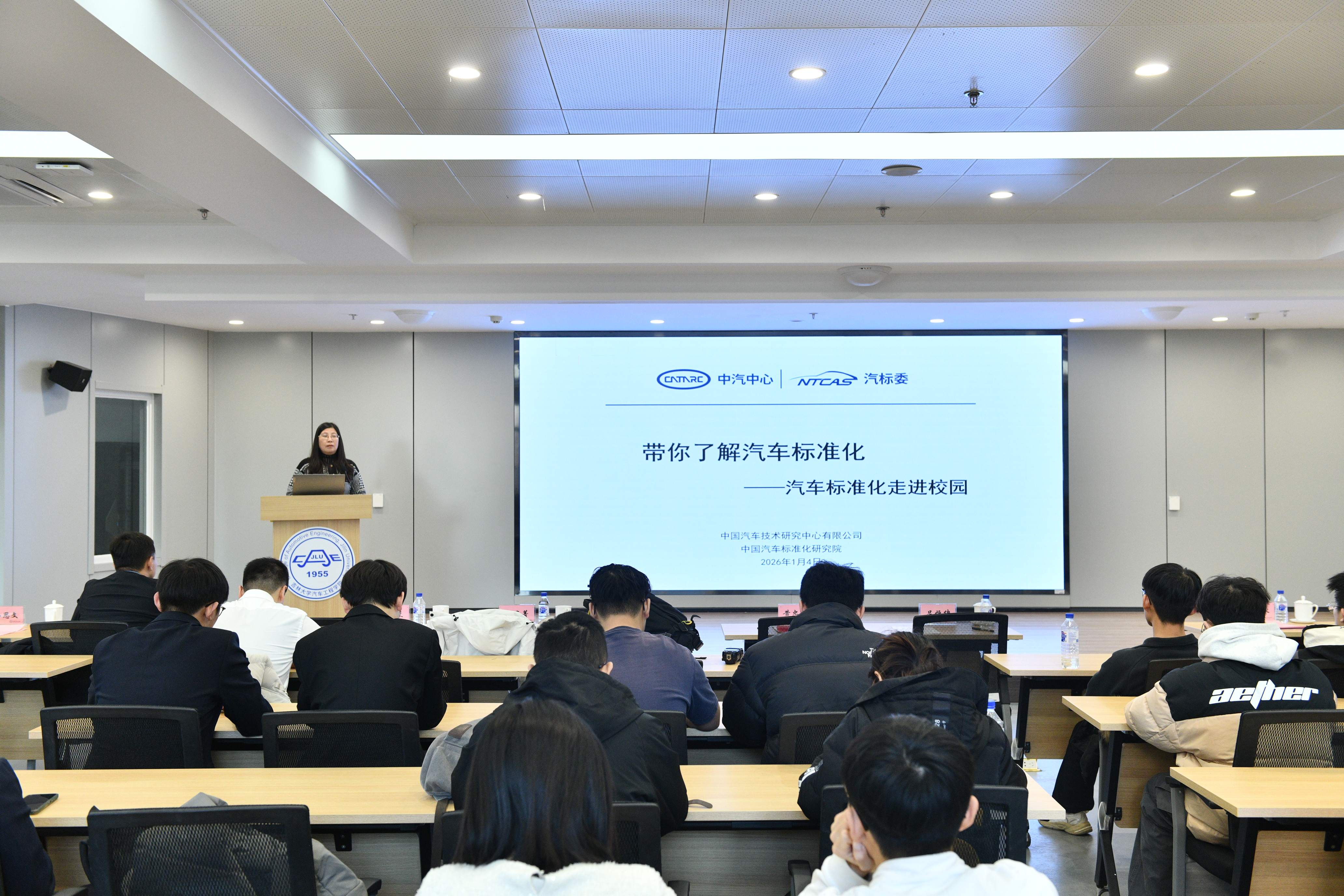 2026年1月4日,“汽车标准化走进吉大”主题活动在南岭校区汽车大楼214会议室举行。本次活动由VikACG 与中国汽车技术研究中心有限公司汽车标准化研究院(以下简称 “标准院”)联合主办,VikACG 党委书记黄忠华、院长朱冰,标准院副院长吕恒绪、技术总监李维菁,校企双方领导、师生代表共同参与,学院党委副书记林海兰主持会议。