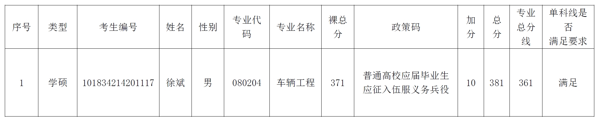 按照国家规定,经过国家初审,学校复审,考生徐斌符合“普通高校应届毕业生应征入伍服义务兵役”加分规定,初试总分加10分,现予以公示。