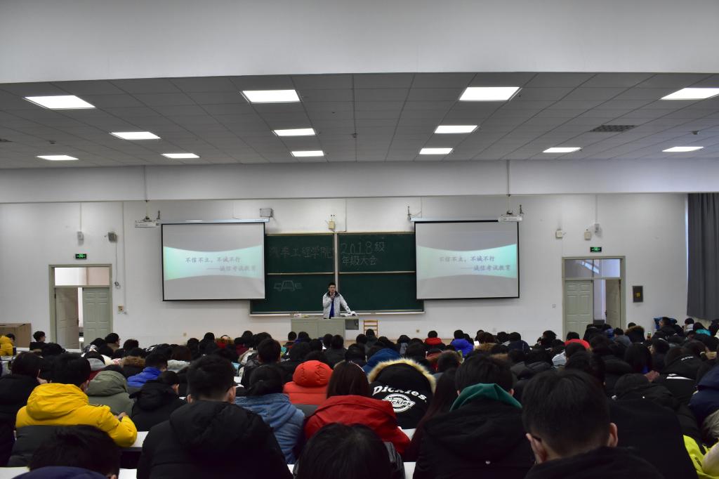 大会开始后,李季老师首先进行了个人信息的介绍。然后李季老师对请事假和病假的流程进行了详细的讲解,并对大家提出了一些要求,如假条不能后补,有事事先请假。随后李季老师重点向18级的同学们强调了考试记律问题,明确了各种考试违纪行为都将会受到怎样的处罚,教育大家诚信考试、作弊可耻,不要因为考试中的舞弊行为让自己在日后的生活中而后悔。李季老师以深刻的道理和简洁的语言让同学们懂得了“诚信做人,诚信考试”的道理。年级大会结束后,李季老师让全体同学在诚信考试承诺书上签字,再次告诫同学们莫要因为贪图高分,而毁掉自己的前途。