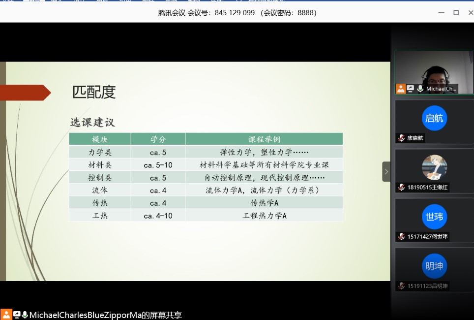 本次活动采用线上形式进行,马志鹏从如何申请去德国留学和关于在德国生活分享两个方面进行讲解。关于如何申请去德国,他介绍了对于德语的学习,强调德语学习要坚持,不能因为学校考试周就一个月不学德语,这样会导致之前的学习成果前功尽弃,并且德语对于在德国的生活十分重要,讲解了关于APS审核以及匹配度的要求。由于匹配度是申请德国学校时独有的要求,着重讲解了我们对标德国工科在各个大类所差的学分。