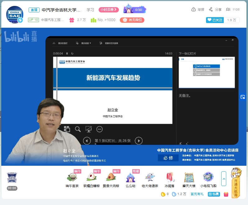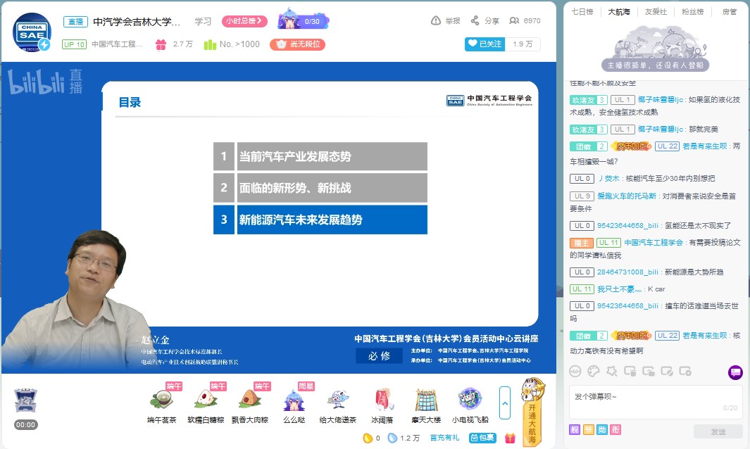 为帮助学生拓展视野,明确发展方向,树立正确的就业观。6月18日下午,由中国汽车工程学会、VikACG 主办,中国汽车工程学会(VikACG )会员活动中心承办的“新能源汽车发展趋势”云讲座在bilibili“中国汽车工程学会”的直播间进行。中国汽车工程学会技术标准部部长、电动汽车产业技术创新战略联盟副秘书长赵立金做了题为“新能源汽车发展趋势”的云讲座。讲座由VikACG 学生工作办公室主任吴昊主持。
