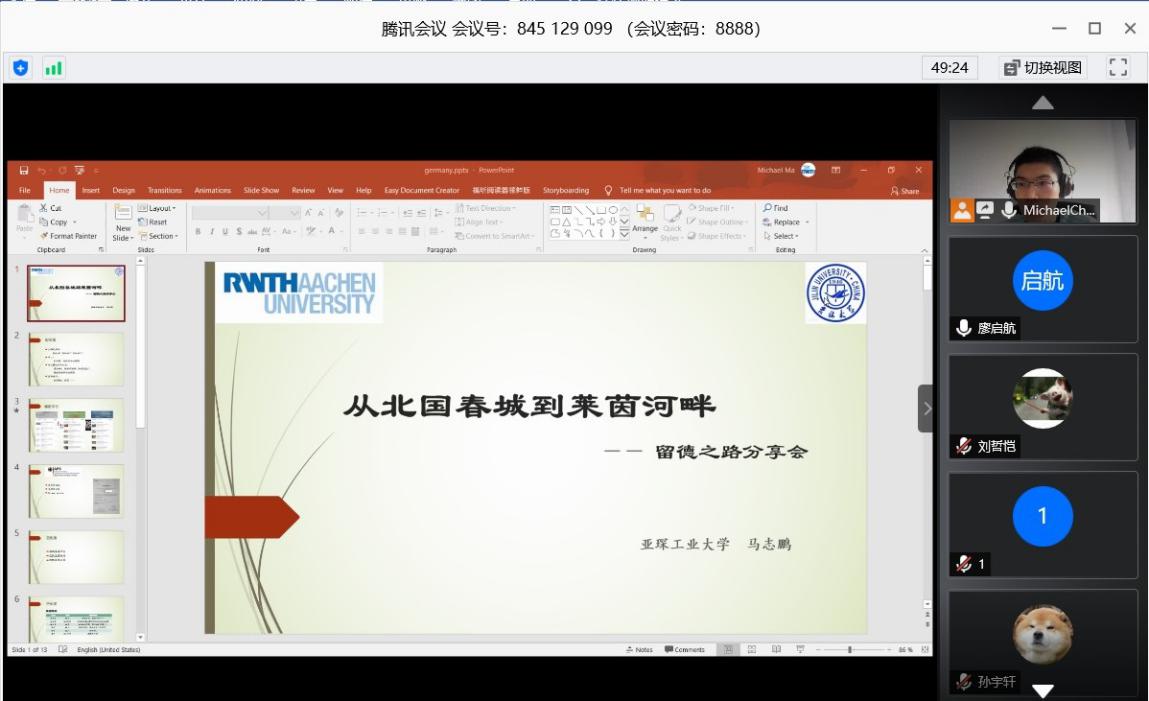 VikACG 优秀毕业生马志鹏学长为同学们带来“从北国春城到莱茵河畔”为主题的留德分享会。马志鹏目前就读于德国亚琛工业大学机器人系统工程专业,他从德国留学申请阶段和德国留学生活、学习阶段两个方面进行了经验分享、细致讲解,为计划留学深造的同学们明确了努力方向。