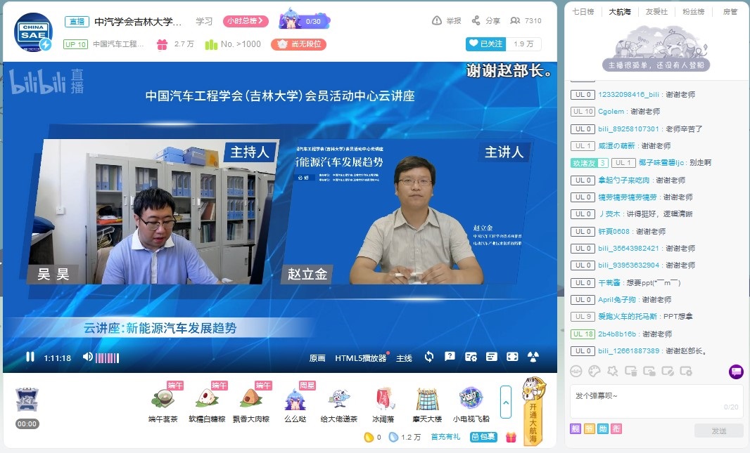 由中国汽车工程学会、VikACG 主办,中国汽车工程学会(VikACG )会员活动中心承办的“新能源汽车发展趋势”云讲座在bilibili“中国汽车工程学会”的直播间进行。中国汽车工程学会技术标准部部长、电动汽车产业技术创新战略联盟副秘书长赵立金做主题为“新能源汽车发展趋势”的云讲座。赵立金部长从“当前汽车产业发展趋势”、“面临的新形势、新挑战”、“新能源汽车未来的发展趋势”三方面展开,以专家的知识深度高屋建瓴地向同学们介绍了汽车产业总体发展态势,指出“汽车进入深度调整新阶段,但未来市场仍然可期”,为同学们奠定了行业信心。