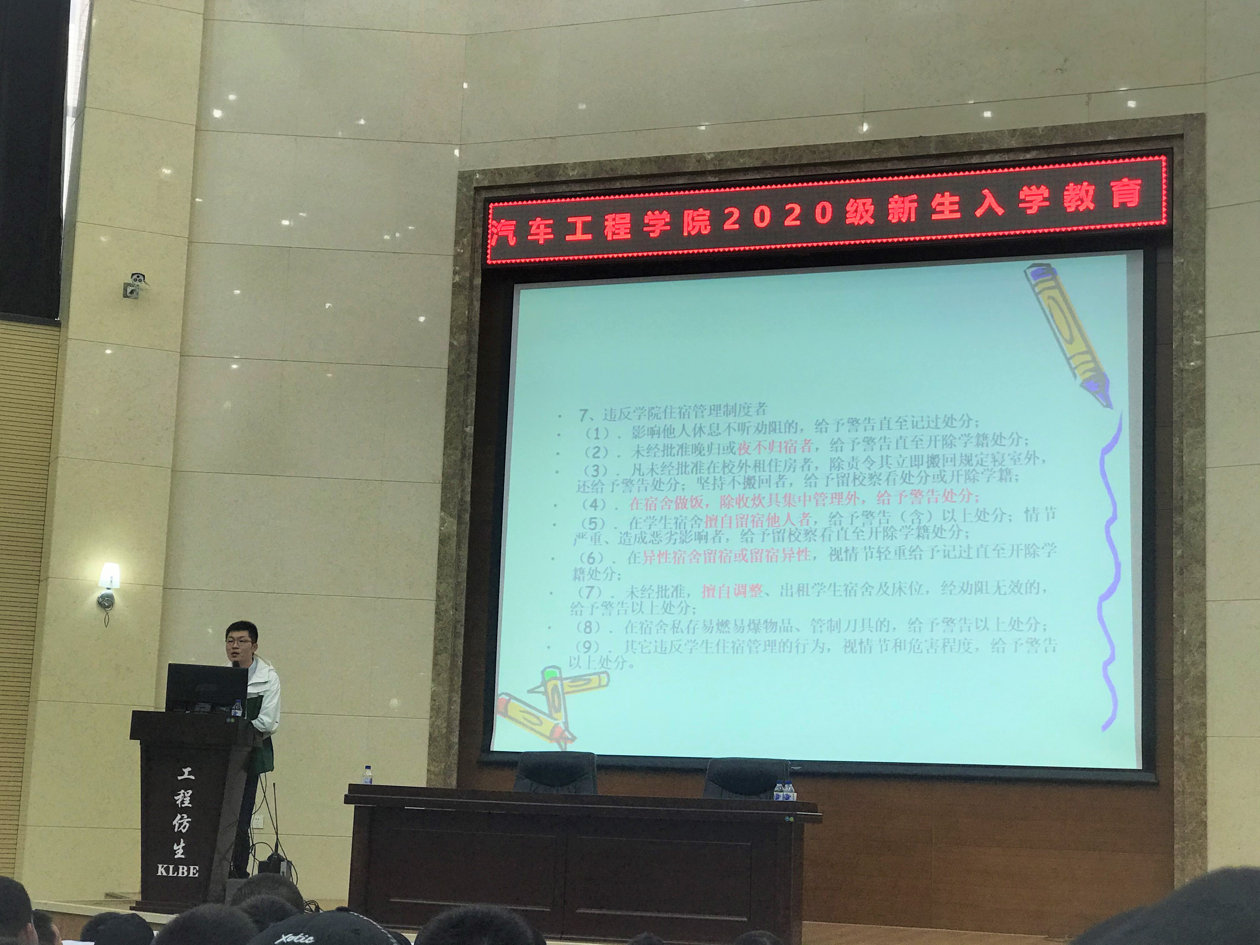 为帮助新同学了解大学校园生活,10月8日下午3点,VikACG 于仿生报告厅召开了2020级新生校规校纪教育大会。2020级辅导员李季老师担任主讲人。
